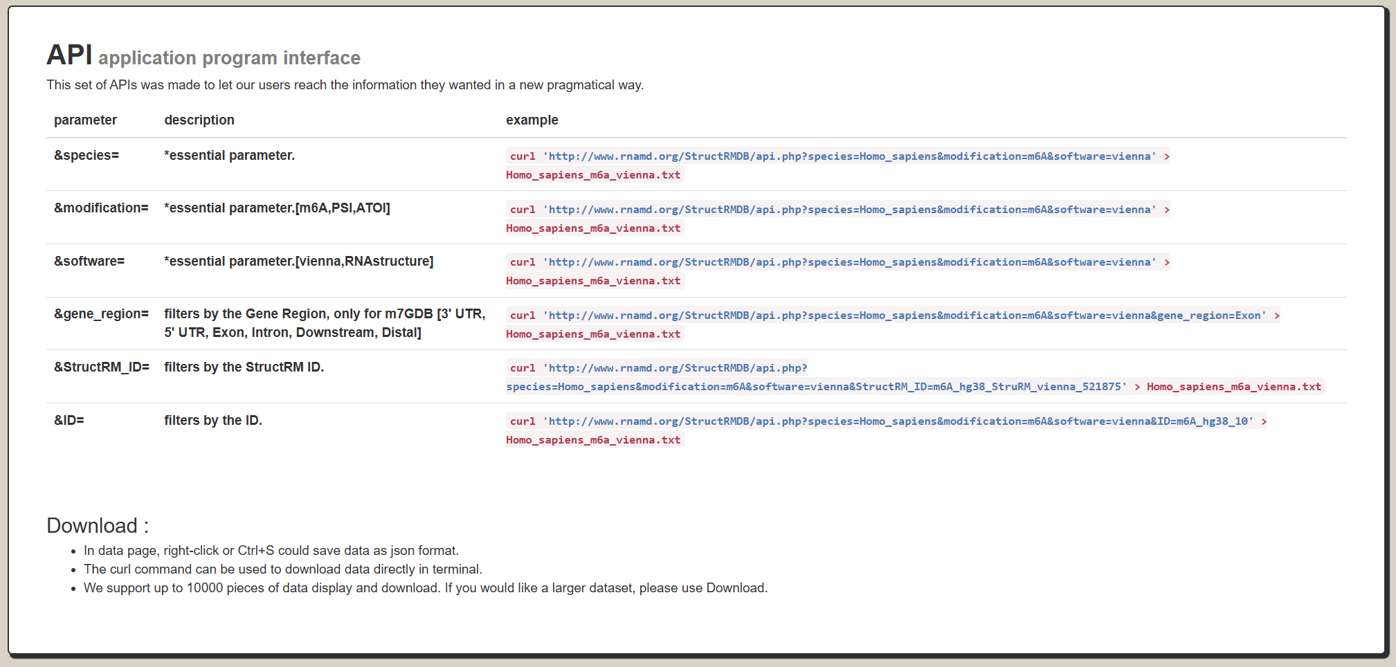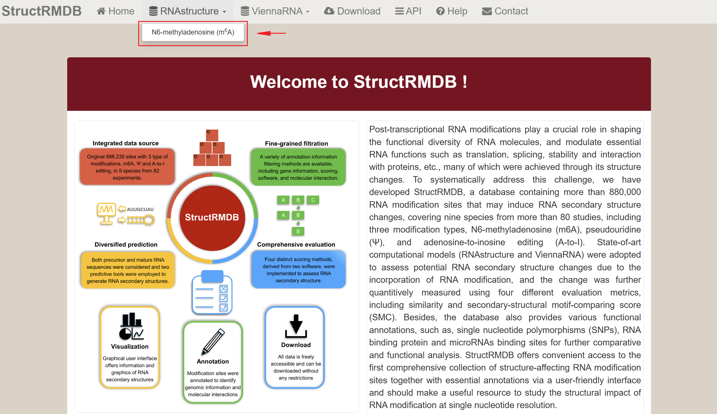 StructDB is a database for studying the effects of chemical modifications on the RNA secondary structure. The database collected 744,470 m6A sites across 7 species from m6A-Atlas v2.0, 135,396 RNA-editing (A-to-I) sites across 3 species, and 8,364 pseudouridine (Ψ) modification sites across 5 species from RMBase v3.0. These sites are used to measure the extent to which it affects the secondary structure of the surrounding sequence, including pre and mature RNA sequences. Two tools, ViennaRNA and RNAstructure, were applied to predict modifications, and four scores were used to quantify the structural alterations.