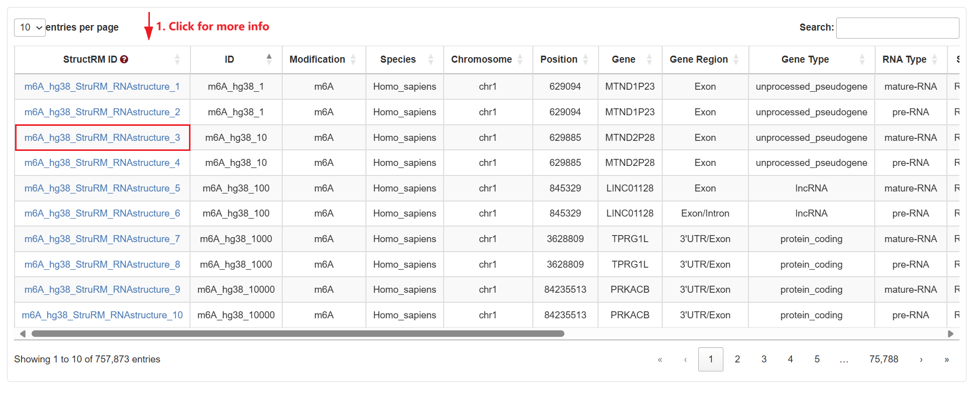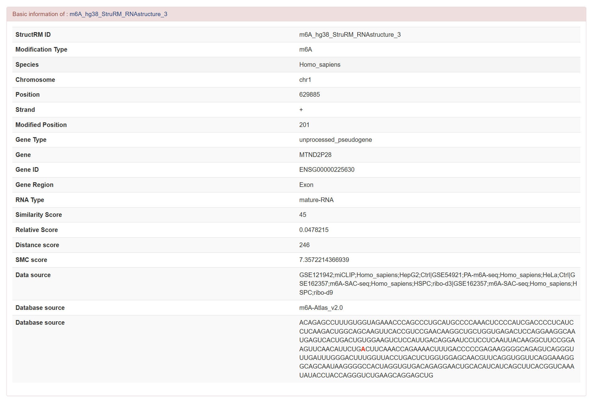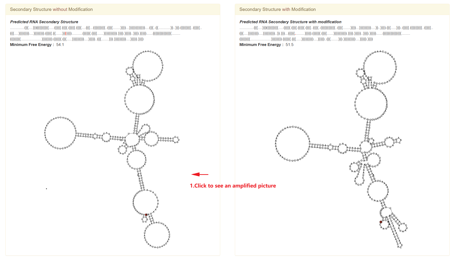 You need to choose one of RNAstructure and viennaRNA to see the specific content. The RNAstructure part contains m6A modification only while viennaRNA contains m6A, RNA-editing (A-TO-I), and Pseudo modification (Ψ).
