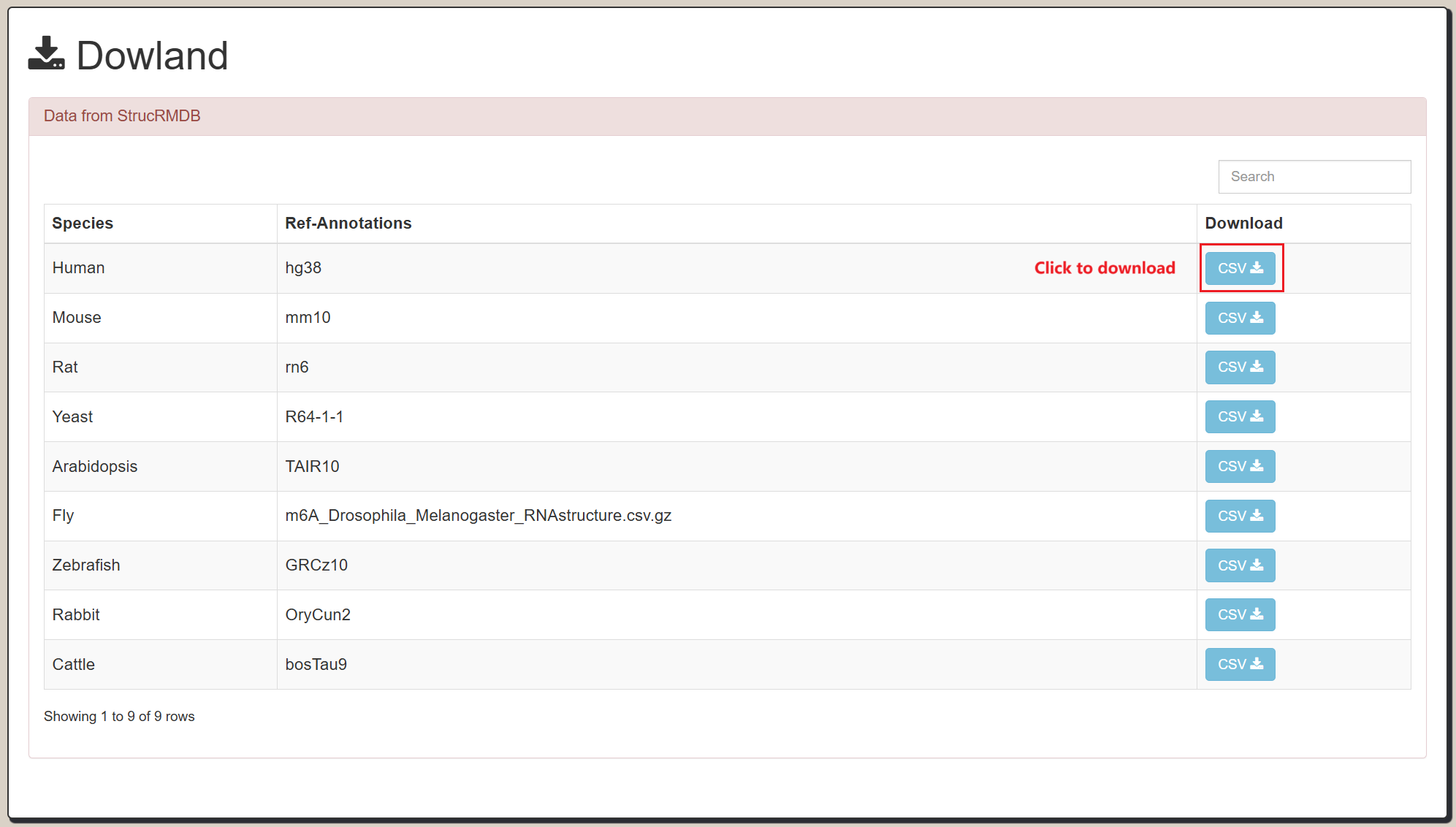 2. Click the blue 'CSV' button to download the data from structRMDB.